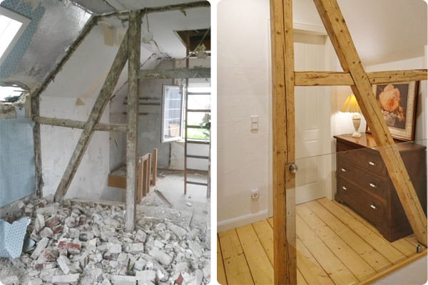 Hinter einigen Wänden verbergen sich richtige Schmuckstücke. Wir legen verputztes Fachwerk frei und arbeiten es fachgerecht auf, die Zwischenräume können auf Wunsch ebenfalls durchbrochen werden.